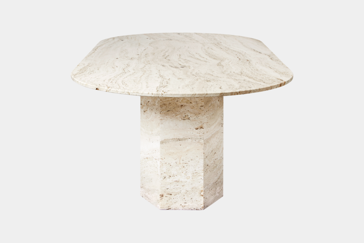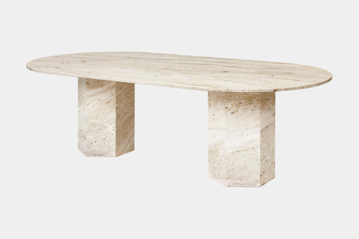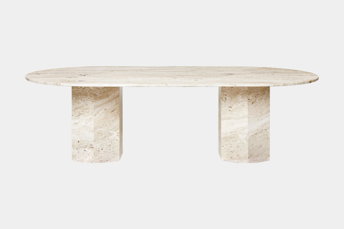 中でもこのエリプティカルタイプは、幅240cmの長尺天板を2本の六角柱ベースが支える大胆な構造美を持ち、建築的な力強さと詩的な静けさを兼ね備えています。使用されるホワイトトラバーチンは天然石のため、表面には天然の穴があり、樹脂で埋め保護処理が施されています。そのため、ひとつひとつ異なる個性的な模様が魅力です。表面はマット仕上げと軽いフィラー加工で、石の冷たさと触感を活かしながら耐久性を確保しています。