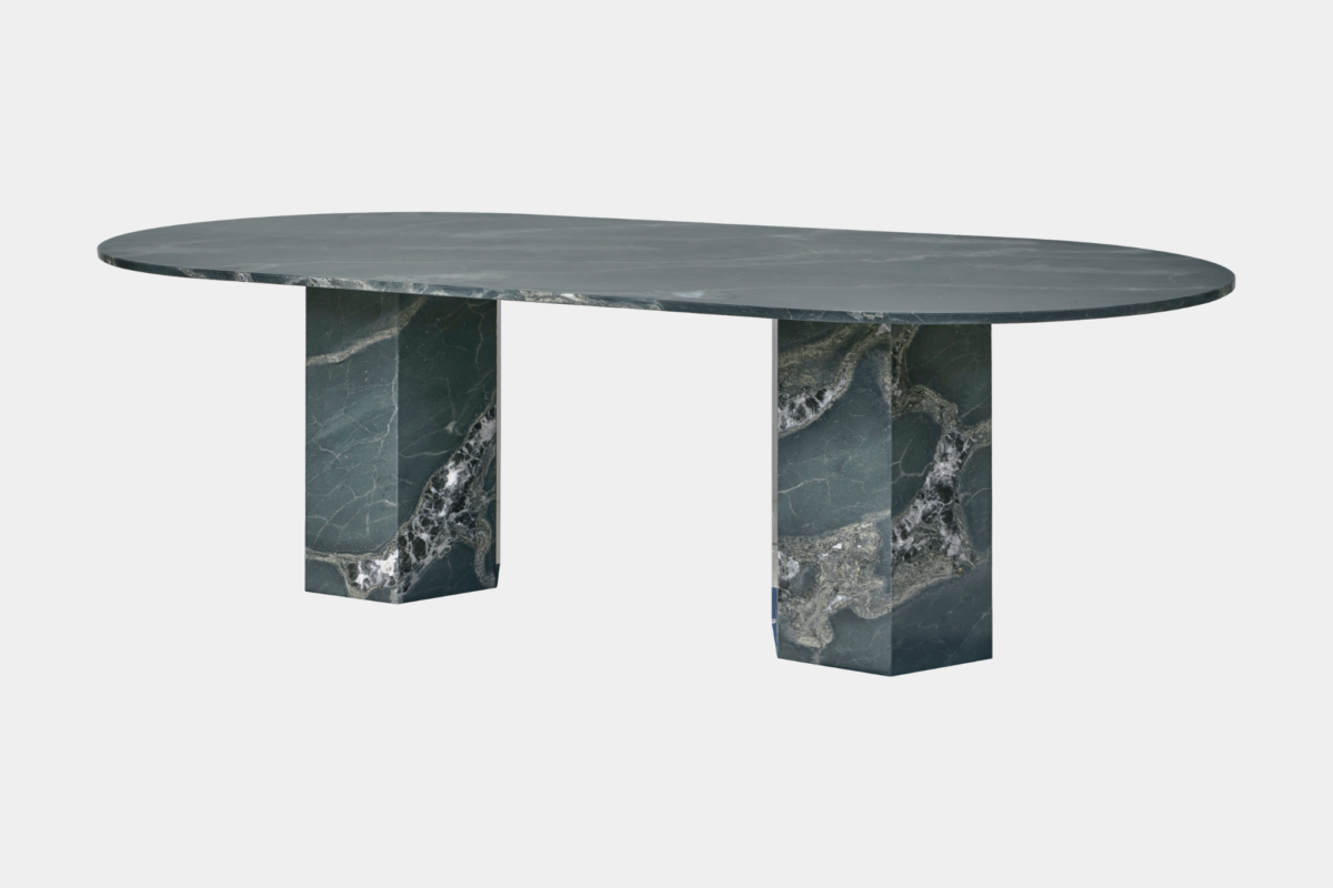 この楕円形テーブルは8人掛けの広々としたサイズで、テラスやガーデンでの贅沢なダイニングに最適です。素材には高い耐久性と耐候性を誇る天然石クォーツァイトを採用。中でも「ボタニックグリーン」は、深緑に黒や灰色の模様、白い水晶の結晶が散りばめられた、自然が生んだ唯一無二の美しさを持ちます。