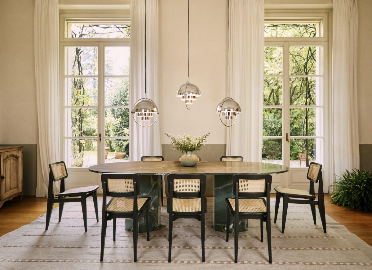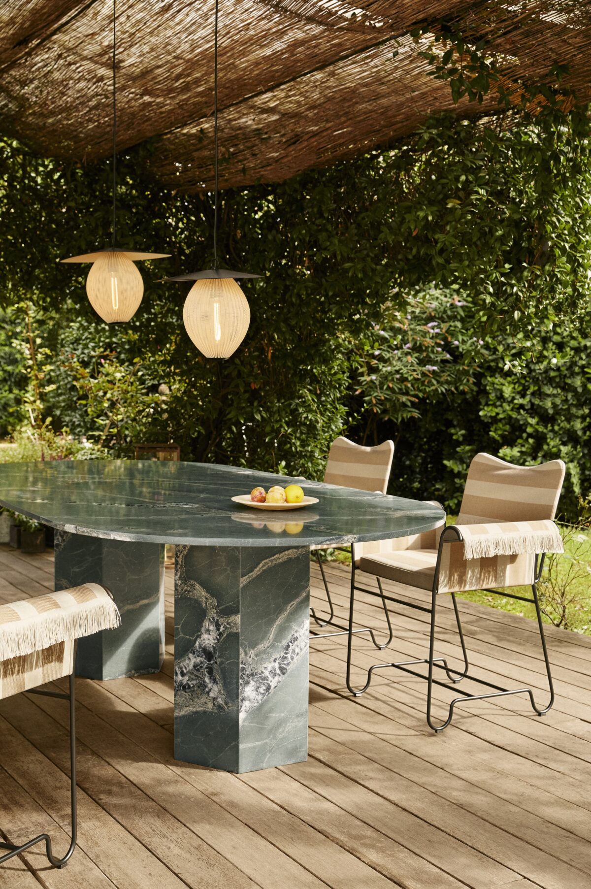 深いグリーンの色調が自然と調和し、落ち着きと洗練をもたらすこのテーブルは、GUBIのアウトドアチェアとのコーディネートにも最適です。